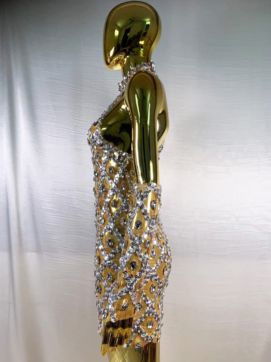 High-end Women's Heavy-duty Rhinestone Plaid Sequined Gloves Ultra-short Dress