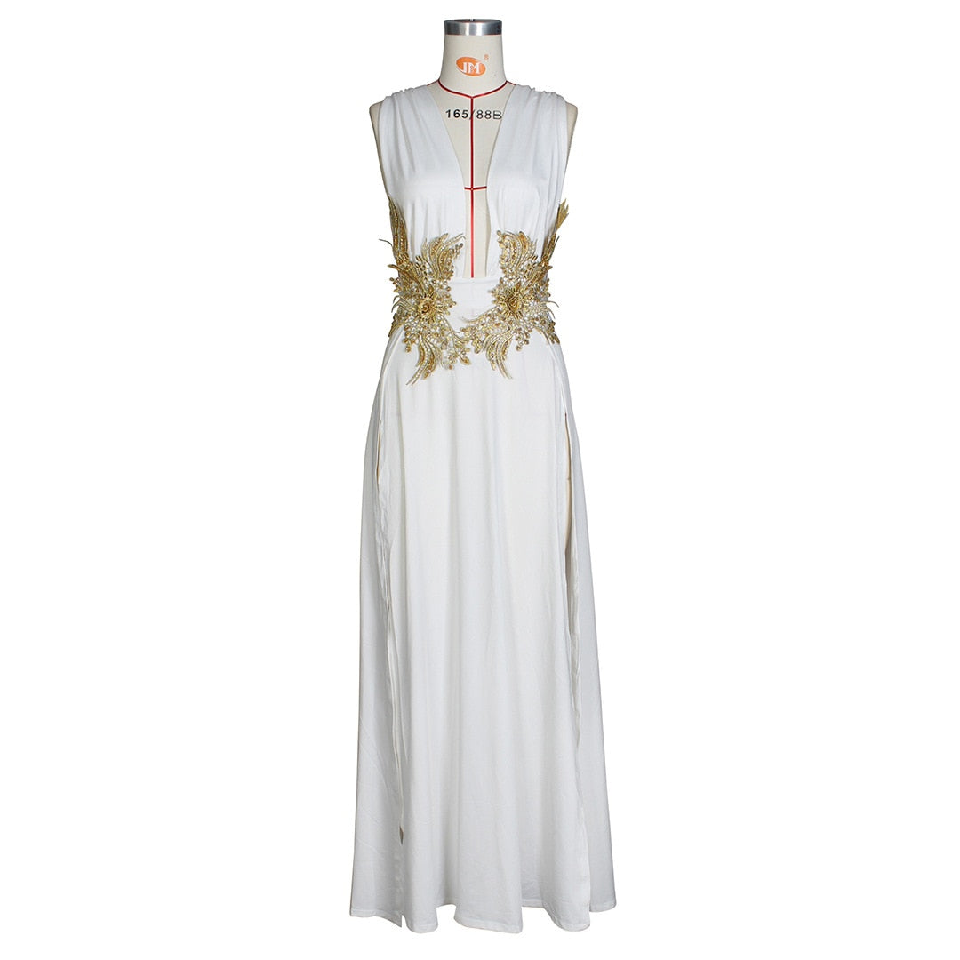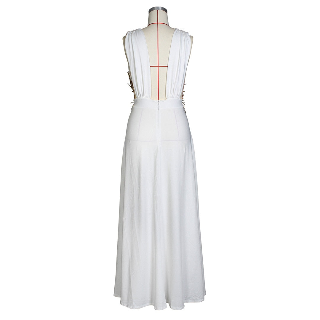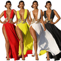 White Sparkly Sequined Splice Long Party Dress Women Deep V Neck Sleeveless Floor Length Dress Sexy Side High Split Robe Dresses